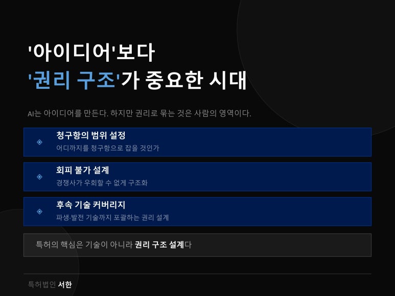 AI는 아이디어를 만들어줄 수 있지만, 그 아이디어를 어떻게 권리로 묶을지는 여전히 사람의 영역입니다.