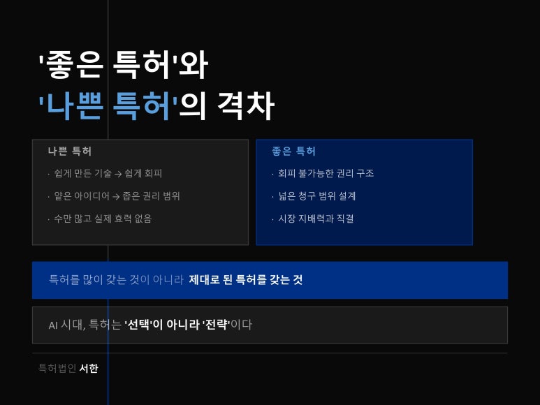 즉, AI 시대는 특허의 중요성을 낮추는 것이 아니라 특허의 ‘질’을 더 중요하게 만드는 시대입니다.